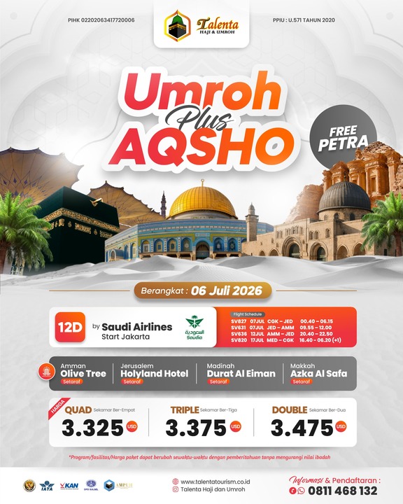 Travel Umroh PT. Talenta International Tourism telah berpengalaman selama bertahun-tahun dalam menyelenggarakan ibadah umroh. Percayakan perjalanan umroh Anda bersama dan ciptakan kenangan indah yang tak terlupakan. Segera tekan link ✅ booking umroh untuk mengamankan seat sebelum kehabisan. Jangan lewatkan kesempatan ini untuk merasakan pengalaman umroh yang istimewa dan tak terlupakan!