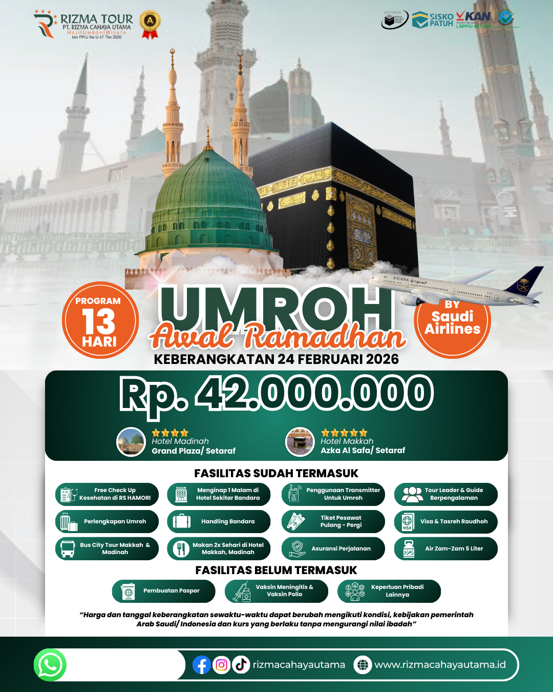 Kami hadir menyediakan Umroh Selama 13 Hari spesial yang dirancang untuk memberikan pengalaman spiritual yang mendalam dan tak terlupakan. Bersiaplah untuk merasakan nikmatnya beribadah Umroh di Tanah Suci!